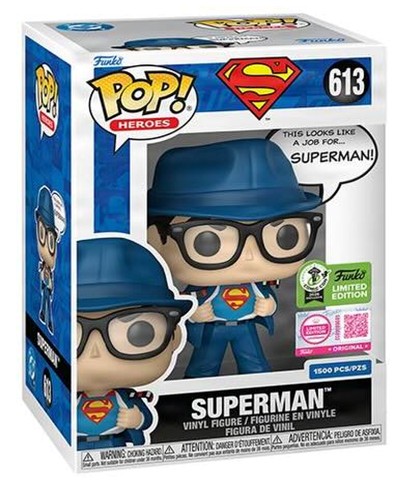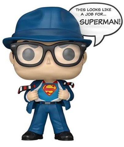 Rendered in Funko's signature stylized design, the figure captures Clark Kent mid-transformation in his classic reporter attire, complete with glasses and overcoat, as he reveals the emblem beneath his shirt. A comic-inspired speech bubble reading, "This looks like a job for... SUPERMAN!" enhances the storytelling element of the piece, paying tribute to a defining visual moment that has resonated with audiences for decades.