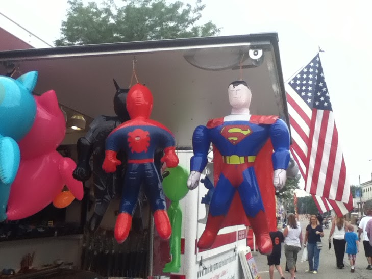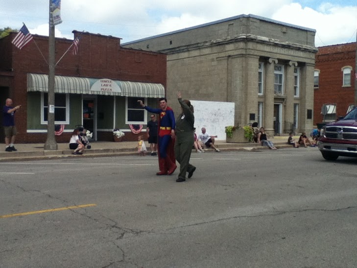 Attractions returning to the festival this year included Fishing With The Mayor, "We had...really...our best turnout. We had, actually, our biggest attendance this year, and it was because of having it with the festival, and getting a lot of children, and families...we've always tried to make the SuperFest a family-orientated festival, and we emphasize on doing family-orientated events," said Mayor Hausler. “This was the best turnout that [we’ve had]…we extended the hours, and I went there…it hadn’t even started, and there were already 25...30 people there fishing. So, I know we had a great turnout. They have a great local sponsor, Plano Molding and the Wurst Kitchen, so they really help out with [Mayor Hausler‘s] ‘Fishing With the Mayor,’” said Martens. "That is just such a...[the Mayor] has such a good turnout, we expanded the hours this year, and the kids just love that...they really enjoy it. We expanded it...5 hours...last year, I think it was only 3 or 4," said Diaz. Kids Super Inflatables was another returning attraction, "That was a very well-attended event. There were lines to get into [Kids Super Inflatables], and for the children to do that. [The age groups were] anywhere from 2 to 7, or 2 to 6. They were very young children," said Mayor Hausler. "We set them up, and...they have a resting tent next to it. Kids from 1 to 12 or 14 can go in it...[there are obstacles]...things that you can do, and then we also have the Superman Jump House...Bounce House," said Diaz, "It runs from 10 until 6, and I think [they've] really drawn a crowd. I think [we'll] probably get 200 to 300 kids that participate with that...The younger ones love that stuff." "They have, probably about four different bouncy tents that [kids] can climb into. That has been busy all morning and afternoon...there's probably hundreds of kids going through that," said Gardner, "[The age groups were] probably 10 and under...maybe 12...just young children." There was a Kids Old Fashioned Game Area, “We were very impressed with how well-received [the ‘Old Fashioned Kids Carnival‘] was, as well,” said Martens. "There were quite a few people doing that...quite a few kids...those were, I would say, from 5 to 12 or 13 [years of age]," said Mayor Hausler. "We had 6 games...we had a golf game, we had [a] ring toss game...various...games. The activity has [increased from] last year...we have more people running them this year," said Gardner, the age groups were "Anywhere from 5-years-old...up and up...We'll have all of them [next year]...we might modify them a little bit." The Phone Booth Rally was another popular attraction, "We had the phone booths set up on four corners, right behind the stage area, and right by the flag mural on our corner of Center and Main Street, and it was...I think it was better this year...more attended this year than last year. I was able to see a couple of the relays, and it's really a neat event, because people act out the 'Superman' thing...going in...changing your clothes...either being Clark Kent or Lois Lane, and then getting out, and being timed for that. It's a very fun event, and...it was very well-attended," said Mayor Hausler. "We started that last year...that's a lot of fun. What they do is...it's a relay, going from one phone booth to another. We have four different costumes; we have the Clark Kent, we have Lois Lane, we have the Superman, and then we have the cheerleader, so Lois Lane when she was in high school. It's really very comical to watch, and, this year, it was sponsored by Heartland Bank and Trust," said Diaz. The Bike Safety Rodeo returned this year, "The Police Department...we have a miniature city that we can set up on the street, and teach young children, and older ones, the proper safety techniques for riding a bike...where to stop, when to [stop the bike], what side of the street you're supposed to ride your bike, and all the rules of the road pertaining to biking," said Mayor Hausler. "That's from the Plano Police Department and the D.A.R.E. program. They map out a small town, and they even have bicycles. They teach children the safety of riding a bicycle. I think they [get] anywhere from 20-30 kids. It all varies...but mostly it's [from] kindergarten to second or third graders, from [ages] 5 to 9 participate," said Diaz. There was also the Andrew Kuebrich Hero Run, "That was a 5K run, and the proceeds for that go to a scholarship fund that's in the name of Mr. Kuebrich. He was a young man in our community that passed away; his family established that. I think there [were probably 200] or 300 people that were in that," said Mayor Hausler. "This year, we had changed the Run a little bit, with the layout, and [the runners] will end at our flag wall, and I think that participation is just as strong as it was last year. I think they had like [260] runners...walkers...and I think the numbers are about there this year...I've seen them in strollers, even," said Diaz. Also returning this year include the Villain's Jail: “The Villain’s Jail is a great little event where you can lock up one of your relatives or friends, and they have to beg for money to get out. So, that’s a great event that raises money for the Christopher Reeve foundation, run by Rural King, one of our local superstores,” said Martens. "It's a lot of fun...I think they do a big fundraiser for the Christopher Reeve foundation. It's from Rural King, one of the local merchants here," said Diaz, "We're going to have some tractors. We are having some old antique vehicles this year. We have the fire trucks and the service trucks. We have the police department's hummer coming. The Army is bringing some of their Humvees. "I just feel that we'll keep all our attractions going strong, but I'd like to add a lot more. [I attribute the returning attractions to] the success of it all, and the participation," said Diaz.