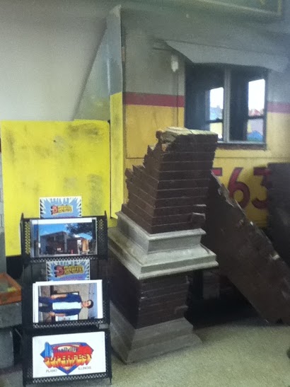 There were a number of props in the museum during last year's Smallville SuperFest. Since then, many have been added. "Since then, we've added, actually...there's something to do with an airplane crash. I invite everyone to come see that. There's probably 25 to 30 different props in there that we're moved around," said Mayor Hausler, "We have some signs [from businesses in the movie] in storage, that we plan on moving in, and moving around, to make the museum look a little bit different, and to freshen it up, and make something new there, so we do have quite a few items that we keep in storage, and then have in our museum." “The train engine is on the wall, and there’s an airplane wing that was laying out…in the road…Then there’s the fake [wall] that’s in there…all the fake brick, and the gas pumps…I [saw] that get [blown] up…that’s really awesome…that was cool.,” said Mulliner. "...The gas pumps...we [have] one gas pump in there...a 7-Eleven gas pump that's all burnt up, when Faora threw [Superman] through the entrance of the building, and knocked off the gas pumps and blew up the place, so one of those is just all burned up; the other one is not. So, we move them around a little bit, too... hang things from the ceilings...just try to keep it fresh," said Gardner, ""We do have the key for Kal-El's super-spaceship...Warner Brothers donated a key...it's just a little thing as big as your finger...[the ship] came to life...we have that, and that's a pretty cool thing. My favorite part of the movie is Main and Center Street, where the big Flag Wall here is in town, with the spaceship landing there...that just pretty much blew me away...I've been going past that street for...years, and I've never seen a spaceship land there before...There is a basement in [the Depot]...some of [the props go] down there, just for storage. We'll switch things back and forth, as time goes by...once [props are] here...we might rotate them in and out, just to [kind of] keep things fresh, something a little different now and then, and there's no set schedule for that...[when] somebody donates something..." "On Sunday, at SuperFest, we've having a costume contest, and the winner of the costume contest is going to get a chunk of brick wall/styrofoam, from the movie....that was the most prominent [one] in the movie," said Gardner. "We have contact with Warner Brothers' representatives, so we have a very good relationship with those folks, and, eventually, I think all of us would like to see...I know number one on my wish list would be the Superman suit," said Mayor Hausler.