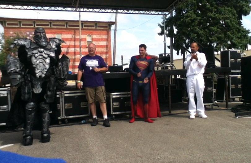 Mayor Hausler explained what was involved in planning this year's festival, "Because everyone is a volunteer, and no one is really paid for doing this, it's just difficult to get people to put the time in that needs to be done. Also, there are so many different entities that participate, sometimes the communication areas are not as well as they could be. So, those are [kind of] the background things that are difficult. The easiest aspect was probably, again, even though it was challenging, but the easiest aspect is having these other organizations take control of their portion of the festival. So, everything isn't on the volunteers. Like I said, it makes it challenging, but it makes it easier." "The SuperFest Committee is...it's running with probably about 12 or 13 people...it's not a really big Committee...we get a lot done. These...people are...making phone calls, getting vendors lined up...the bands lined up...they're really great. We work with the mayor, and the city has been very helpful to us," said Gardner. “The easiest is the entertainment, because we get great response from bands that want to play our fest. So, at this point, right now, I already have at least half the bands booked for next year, because of how many we do; we don’t want to turn it into just a music fest, so we do festival music on the weekends…Friday and Saturday night…and then Sunday we did a bluegrass jam today, and there’s the local Northern Illinois Bluegrass Association that came out and played probably 3 hours of some great music to kick off our Sunday morning,” said Martens, “The hardest part is keeping everyone working on what we need to remember to do…it’s a lot of organization things that are sometimes the hardest.” "We lost a couple of key members from our Committee...that [kind of] put a little extra burden on everybody. [The easiest thing]...I like building stuff, and I helped build the...booths for the Old Fashioned [Kids'] games...putting stuff together and working with...we got a bunch of volunteers this year, which [was] really nice...they helped out a lot...we had some big strong guys to help move some heavy stuff around...the booths for the Kids' Games are [kind of] heavy wooden plywood and two-by-four structures, and they're getting [kind of] heavy, so it's [kind of] fun working together with people and having a feeling of community...it's nice. That was the easy part, I would say," said Gardner, "What's real nice is some of the vendors are all coming back; they all want to be here. The same ones, again and again and again...which is nice. [We] had the Zipline 3 years in a row now, which is pretty cool. We've had the [Euro]-Bungree...2 years in a row...which is nice. We've had Superboy and Lana Lang here, 3 years in a row...which is pretty cool...which is very cool...they just love posing [for] pictures, for little kids and stuff." “For me…it was easy…just to volunteer for the Depot,” said Mulliner. "The experience...getting more and more experience with it," said Diaz.