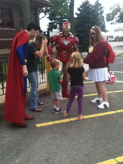 Soffee explained how people reacted to his costume, "So far the new costume has been a very big hit. I was a little nervous in making the Cavill suit...it turned out very well...everyone likes it...like I said, it's a different take; everyone seems to appreciate it." "Our friends, here in Plano, who run the Festival, they liked it, because they even liked when I was discussing to them the idea of doing the classic Lana Lang outfit. So, like, the folks that are the kind of like, the die-hard Superman fans...they liked it. As far as the other people, the visitors that are coming here with their kids and their families, they don't really recognize it as a costume, they probably see...'Oh, that's a cheerleader'...so I don't think that they even recognize what it is...unless somebody has watched the 'Superman' movie over and again, like die-hard fans...no one's really going to know...because this one has just the 'S' on the front...the one last year...more people recognized it as the 'Smallville' cheerleadiing outfit, because it says 'Smallville' across it," said Egan. "The kids..they're like, 'Ooh, that's Iron Man.' For the adults...'Hey, like that's really awesome. Did you make the suit yourself?' 'No, this suit was not made by me; I helped with it, but it was actually the creator of James Fipps...he's one of the...SuperFriends out of St. Charles, Missouri, and multitalented,'" said Krall.