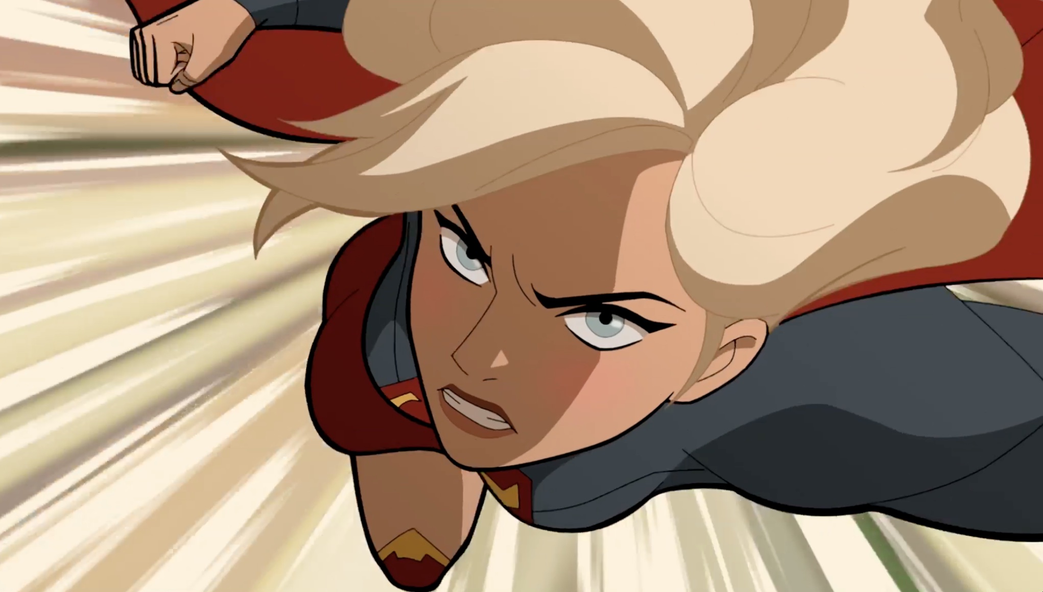Supergirl prepares to level a knockout blow in this close-up of the beloved character during an action-packed scene in Legion of Super-Heroes. Supergirl is voiced by Meg Donnelly (American Housewife, The Winchesters).
